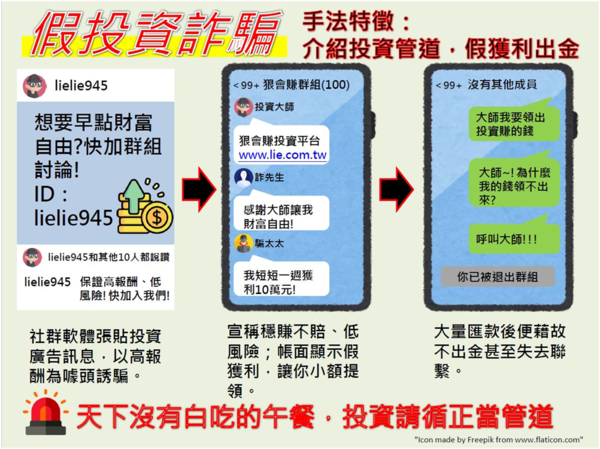1、歹徒會利用FB、IG、YT、Google及簡訊等管道以股市名人、財經專家等人名義投放假投資廣告,或在交友軟體App假交友,宣稱保證獲利、穩賺不賠且利潤豐厚來吸引被害人。